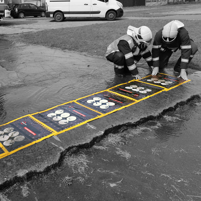 Gefährliche Flüssigkeiten wie Öl, Benzin oder Betriebsstoffe dürfen bei Leckagen nicht in die Kanalisation gelangen. Mit den Kanalabdeckungen von ECCOTARP können die Einsatzkräfte gefährdete Kanalisationseinlässe schnell und effektiv abdichten und damit eine großflächige Verbreitung der Gefahrstoffe und schwerwiegende Umweltschäden vermeiden. Zum Abdecken der Kanaleinlässe gibt es drei verschiedene Ausführungen: