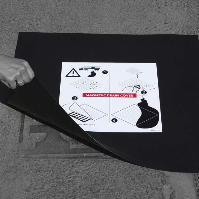 Magnetische Kanalabdeckung MDC: Die magnetischen Eigenschaften der Abdeckung MDC – die wie NDC aus flexiblem Material besteht – verbessert die Haftung auf den meist gusseisernen Kanaleinlässen zusätzlich, ein Verrutschen wird damit nahezu ausgeschlossen.