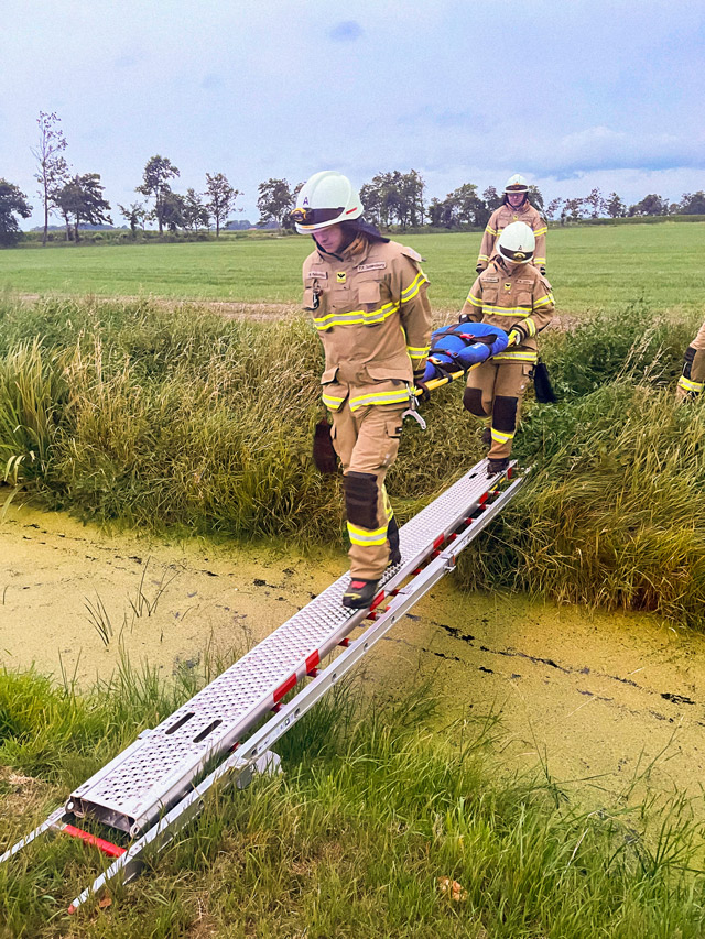 Die 4 m lange Rettungsbrücke ist nach DIN EN 16165:2023-02 ausgeführt, der Laufbereich aus trittsicherem Lochblech entspricht der Rutschhemmungsklasse R13. Mit den vier ausklappbaren Auslegern an den Ecken wird die Abstützbasis verbreitert und ein seitliches Kippen der Brücke vermieden. Reicht die Länge nicht aus, kann die Rettungsbrücke auch auf einer längeren Leiter liegend zum Einsatz kommen und über die Transportsicherung gegen Verrutschen gesichert werden.