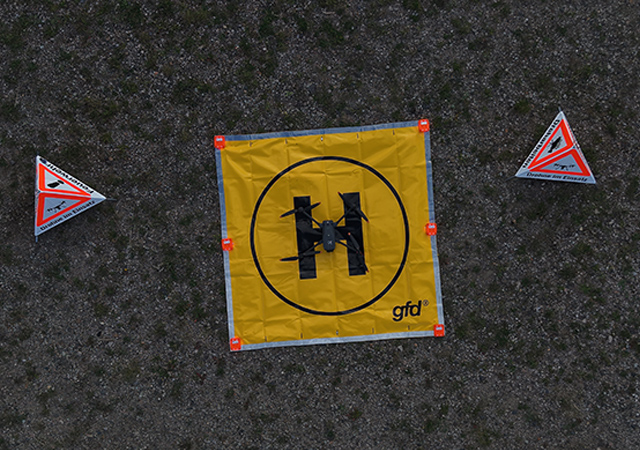Mit der Bereitstellungsplane gfd® Drohne 2.0 von m+h textile Systeme lässt sich der Landeplatz zuverlässig und sicher kennzeichnen. Um flatternde Planen bei immer steigenden Abfluggewichten der Drohnen zu vermeiden, beschweren acht in den Ecken und an den Seiten integrierte Metallgewichte den Planenrand und können zugleich zur Befestigung von Kennzeichnungsleuchten mit Magnetfuß genutzt werden. Für noch mehr Stabilität sorgt ein einzigartiges, mit Fiberglas verstärktes Gestänge (Zubehör), das in Halterungen an der Unterseite der Plane eingeschoben wird.