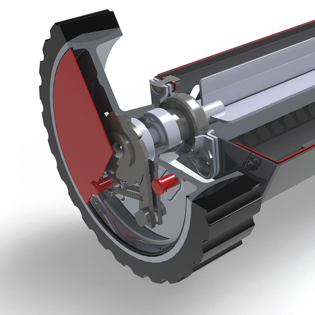 Eine Spezialübersetzung in den Rädern stoppt das Streuen bei Rückwärtsbewegung automatisch, um Bindemittel einzusparen.