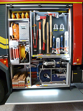 - LUKAS Rettungsgerätesatz (Pumpenaggregat P 650 SE, Einfach-Schlauchhaspel SHR 20, Schneidgerät S 700, Spreizer SP 310, Teleskopzylinder R 420 und R 424, Air-Bag Safe, Abstützwinkel LRS-C, Schutzdeckenset)