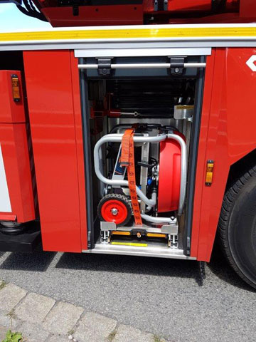 Elektrisch verstellbarer Monitor am Korb mit verstellbarer Monitordüse, fest verlegte Wasserführung seitlich im Rettungskorb