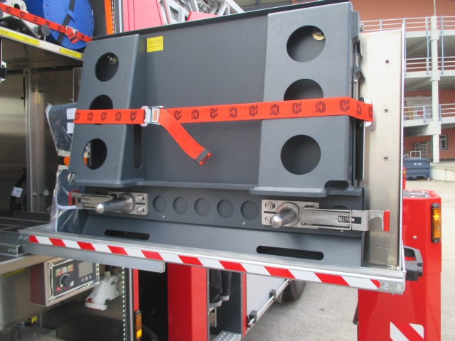 Elektrisch verstellbarer Monitor am Korb mit verstellbarer Monitordüse, fest verlegte Wasserführung seitlich im Rettungskorb